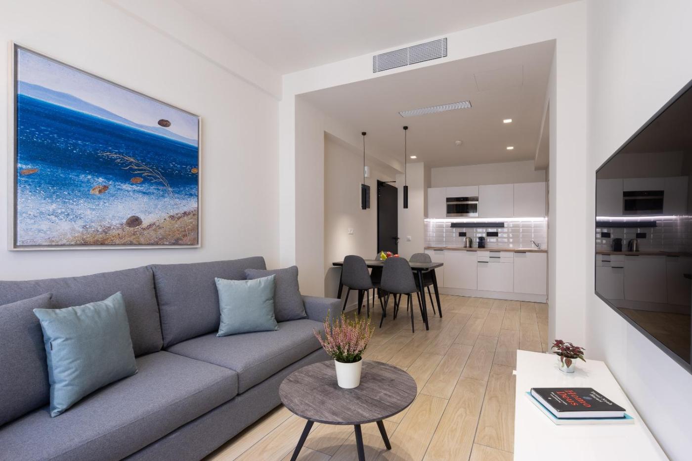 Superior Apartment. This apartment is comprised of 1 living room, 2 separate bedrooms and 1 bathroom with a shower and free toiletries. The well-fitted kitchenette features a stovetop, a refrigerator, a dishwasher and kitchenware. The air-conditioned apartment offers a flat-screen TV with cable channels, a washing machine, soundproof walls, a tea and coffee maker as well as city views. The unit offers 3 beds. ;