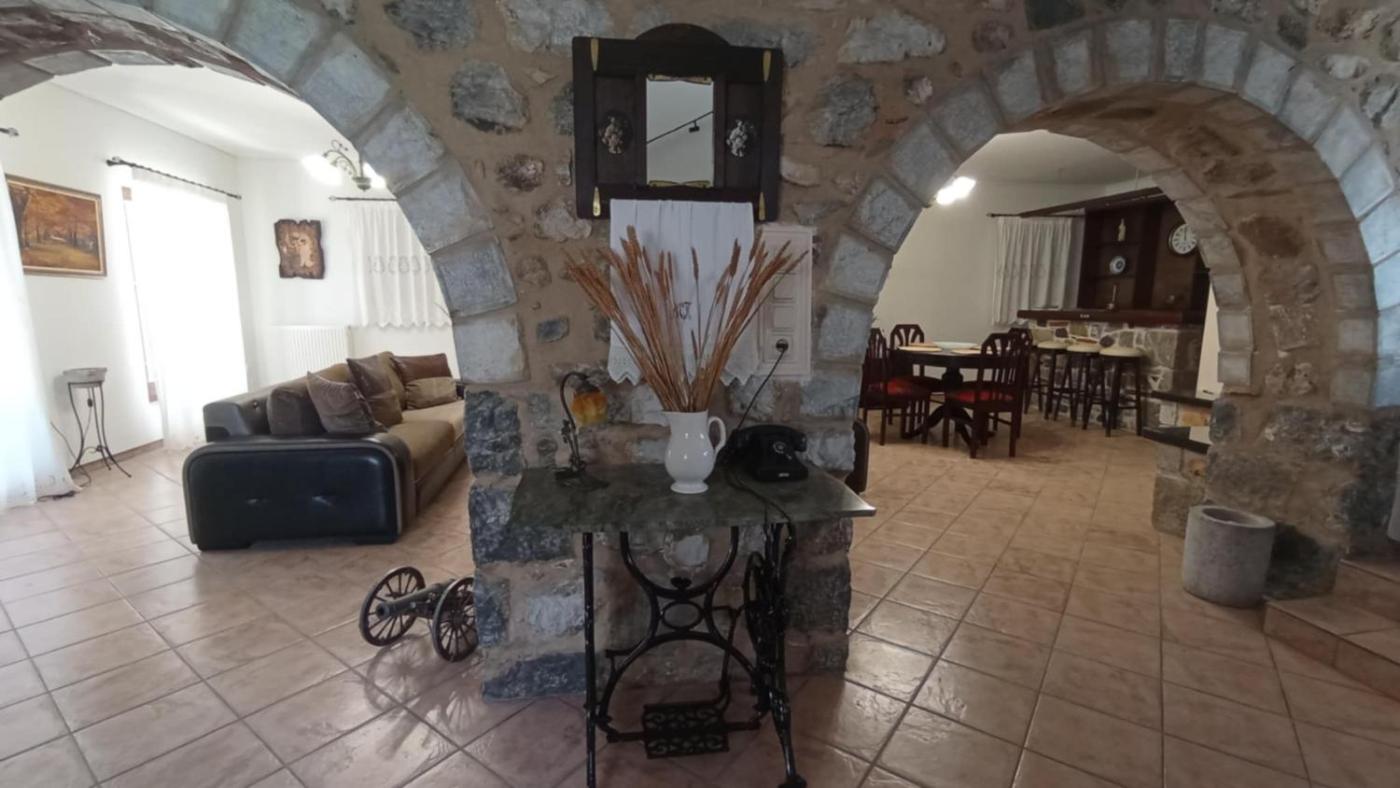 Villa - Split Level. Villa Iris is spread across two levels, offering a perfect blend of traditional charm and modern comfort. The traditional stone arch walls and antique decor elements are seamlessly paired with contemporary amenities. The ground floor features an open-plan living room that connects to the dining area and kitchen through the archways. It includes a cozy fireplace, a smart TV, a comfortable dining table, and a bathroom with a shower. A marble staircase leads to the upper floor,youll find three spacious bedrooms. The master bedroom provides a peaceful retreat with a queen-size bed and an ensuite bathroom. The two additional bedrooms, one with a queen-size bed and the other with two semi-double beds, open onto a balcony with views of the picturesque plane tree square. These bedrooms share a large bathroom with a bathtub. The expansive garden, patio, and balconies provide guests with a variety of spaces to enjoy throughout the day. As the sun sets, the garden’s atmospheric lighting enhances the experience, making it the perfect spot for relaxing in the furnished gazebo or patio. The property offers free parking with enough space for two cars. Villa Iris can accommodate up to 6 guests, with an additional sofa on the upper floor available to accommodate one more guest upon request.