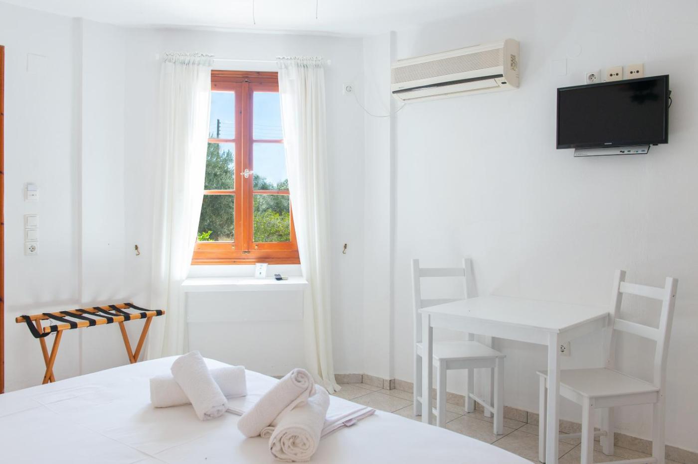 Apartment (3 Adults). This apartment consists of 2 rooms. It includes 2 air conditioning units and 2 TVs, one in each room. Overlooks the garden and olive groves. Free upgrade to sea-view rooms can be provided upon availability. ;