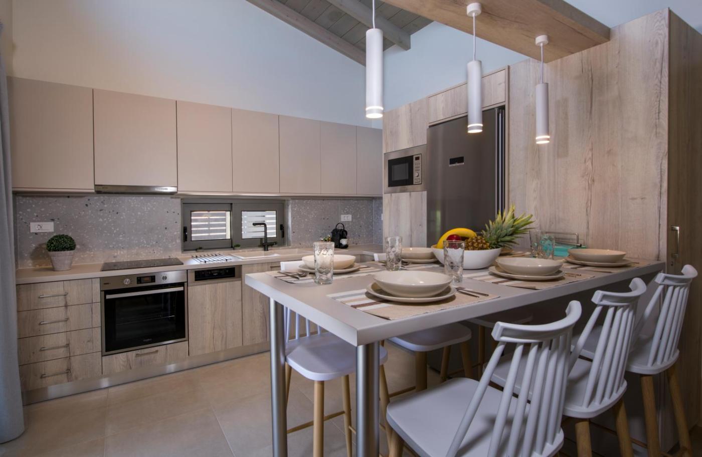 Two-Bedroom Villa. This villa features a hot tub. Boasting a private entrance, this air-conditioned villa features 1 living room, 2 separate bedrooms and 2 bathrooms with a walk-in shower and a hairdryer. Guests will find a stovetop, a refrigerator, a dishwasher and kitchenware in the well-equipped kitchen. The villa also comes with a barbecue. Featuring a terrace with sea views, this villa also features a washing machine and a flat-screen TV. The unit has 3 beds.